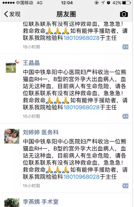 时间紧急,病情危重,患者已经出现休克状态,该院医护人员立刻同患者家属沟通献血事宜,却得知患者家族中无相同血型。医护人员随即与阜阳市中心血站联系,却得知阜阳市中心血站熊猫血告急!怎么办?!时间一分一秒流逝,患者出血量持续增加,随时有生命危险!该院医务人员即刻在院内外微信群、QQ群、朋友圈发出求救,同时与阜阳市广播电台取得联系,积极向广大市民求救,仅仅几分钟,整个朋友圈热心人士百余人转发此条消息,具有相同血型或联系方式的热心市民,在半个小时内就打爆了该院检验科主任的手机。经过多方联系,积极调配,19:00左右,阜阳市中心血站将别院提前预约的800毫升红细胞,400毫升血浆及时调配给该患者使用,所有人悬着的一颗心才落了下来。