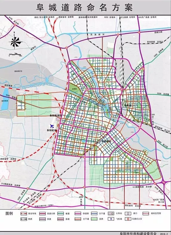 本此对阜城总规路网中所有道路(共计各级道路319条)进行命名,共调整道路名称110条。其中,颍河与泉河之间的泉北片区,共调整道路名称10条;颍河以东的河东片区共调整道路名称37条;泉河以南、高铁以东、颍河及京九铁路以西的河西片区,共调整道路名称14条;京九铁路以东的颍南片区共调整道路名称49条。此次道路名称调整主要有以下特点: